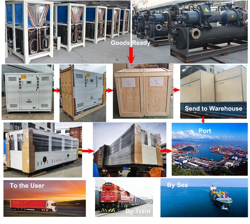 Als professioneller Lieferant und Exporteur von Wasserkühlern verfügen wir über einen eigenen Spediteur, der den Versand organisiert. Unsere Kühlmaschine ist mit einer Sperrholzverpackung ausgestattet, die Schäden während des Transports verhindert und den Exportstandards entspricht. Es gibt drei Möglichkeiten, Ihre Kühleinheit zu liefern: